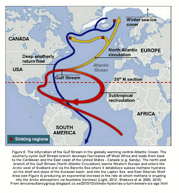 The Gulf Stream which starts SW of Florida, crosses and bifurcates in the Atlantic where it undergoes excessive global warming in Summer and forms an area of extreme evaporation (Figure 6; Light 2012; Shakova et al. 2008, 2010; Devconsultancy 2010). A southern cyclic branch of the Gulf stream develops Hurricanes off West Africa and leads them back to the Caribbean and the East Coast of the United States and Canada as has just been exemplified by the devastating super storm Sandy (Figure 6). The north east branch of the Gulf Stream (North Atlantic Circulation) warms Western Europe and the increasing Gulf Stream evaporation is causing a large increase in European rainfall, This NE branch of the Gulf Stream enters the Arctic Ocean west of Svalbard with a separate branch via the Barents Sea and where these two branches converge on the shelf slope region at the end of the Eurasian Basin in the Laptev Sea they destabilize the methane hydrates (see Figures 4a, 4b and 6) producing an exponential increase in the rate at which subsea methane is erupting into the Arctic atmosphere as fountains (torches) up to 1 km across (Figures 6; Light 2012; Shakova et al. 2008; 2010).