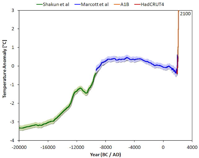 - the reconstruction of regional and global temperature for the past 11,300 years published in Science in March 2013. One result is shown in the above figure.