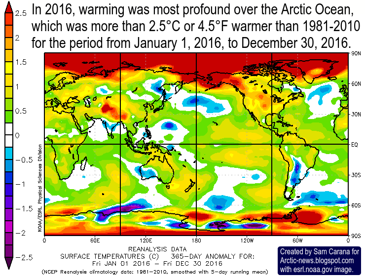 Over the entire year 2016, warming was most profound over the Arctic Ocean, which was more than 2.5°C or 4.5°F warmer than 1981-2010, as illustrated by the image below.