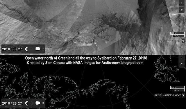 On February 27, 2018, large parts of the Arctic Ocean north of Greenland had turned into open water, as illustrated by the image below.