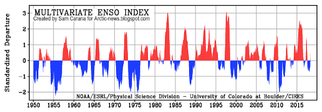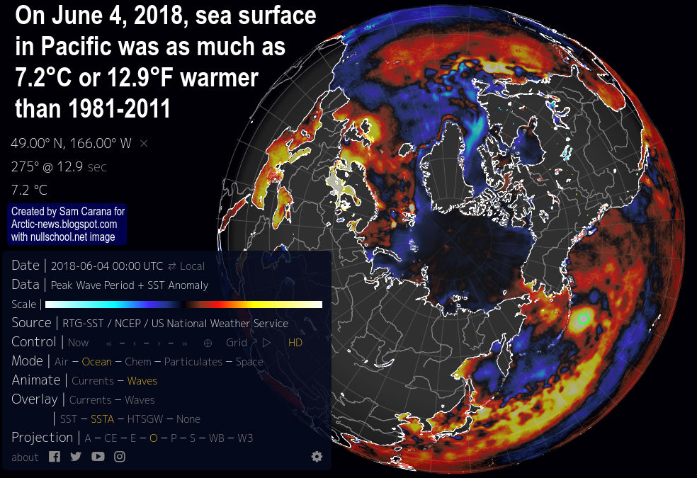 Here's another warning sign. Peak sea surface temperature near Svalbard rose from 12.4°C or 55.4°F on February 23, 2018, to 15.6°C or 60°F on March 2, 2018, as illustrated by the red line on the image on the right, with the blue line showing the 1981-2011 average.