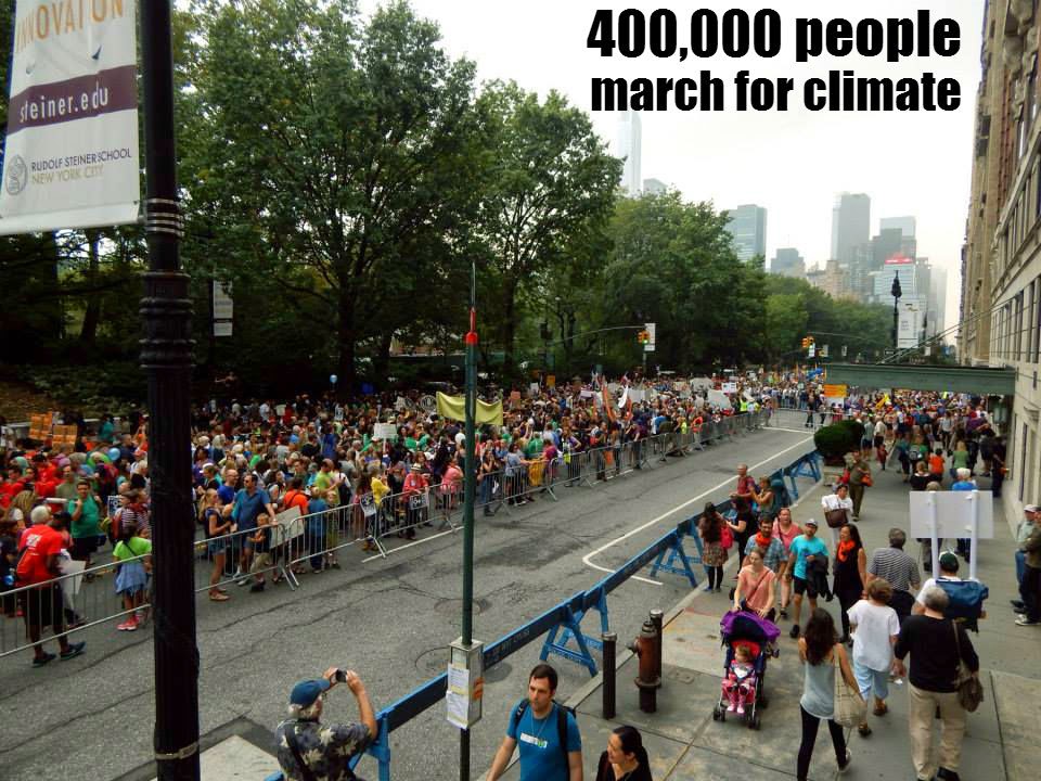 How big a deal was the march in Manhattan yesterday? One of the organizers was 350.org, a group started by Bill McKibben based on a paper by climate scientist James Hansen which stated that we should aim for about 350 parts per million (ppm) CO2. We are currently at about 400ppm, so we need to move "only" about 50ppm in the opposite direction from our rapid growth, which hit a frightening 3ppm clip last year.