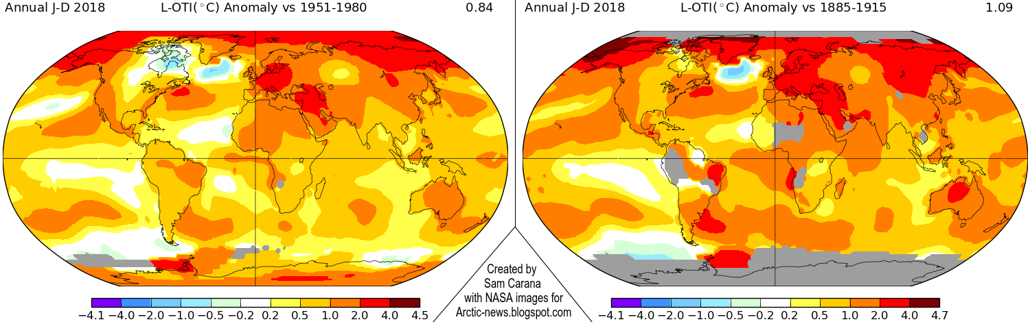 Furthermore, have another look at above maps. Much of the extreme anomalies are in line with changes to the Jet Stream, as also illustrated by the insert. More cold air escaping the Arctic and more warm air entering the Arctic are both speeding up Arctic warming. In the map on the right, much of the Arctic is left grey, since no data are available for the Arctic around 1900, but the Arctic should not be left out of the picture and adding a further 0.1°C adjustment seems appropriate to better include the Arctic.