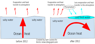 While this cold freshwater may constitute a barrier that slows the flow of warm water toward the Arctic Ocean at the surface, the danger is that it prevents heat transfer to the atmosphere from warm water flowing below the sea surface, with the net result of more heat arriving in the Arctic Ocean.Furthermore, if this cold freshwater lid also prevents water from sinking deeper in the North Atlantic, this may also contribute to more warm water arriving in the Arctic ocean, as illustrated by the bottom image on the right.
