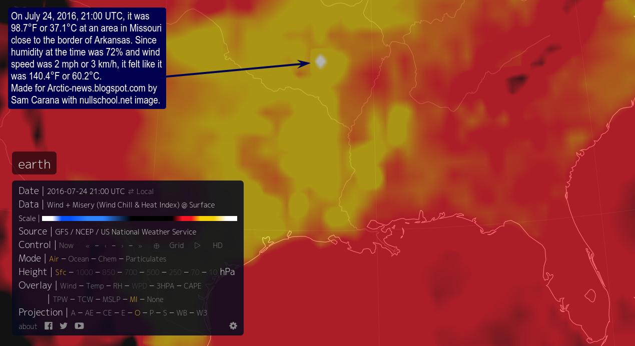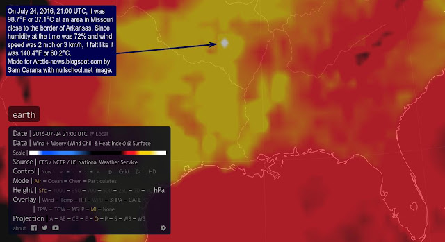 On July 24, 2016, 21:00 UTC, it was 98.7°F or 37.1°C at the green circle on above image. Because humidity at the time was 72% and wind speed was 2 mph or 3 km/h, it felt like it was 140.4°F or 60.2°C.