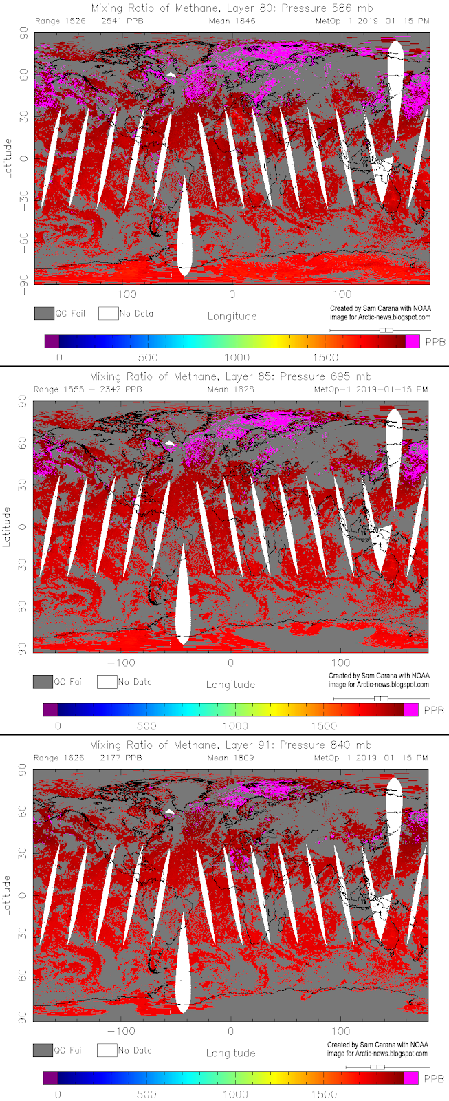 The graph shows July 1983 through December 2018 monthly global methane means at sea level, with added trend. Higher methane means can occur at higher altitude than at sea level. On Sep 3, 2018, daily methane means as high as 1905 ppb were recorded at 307 mb, an altitude at which some of the strongest growth in methane has occurred, as discussed in earlier posts such as this one.