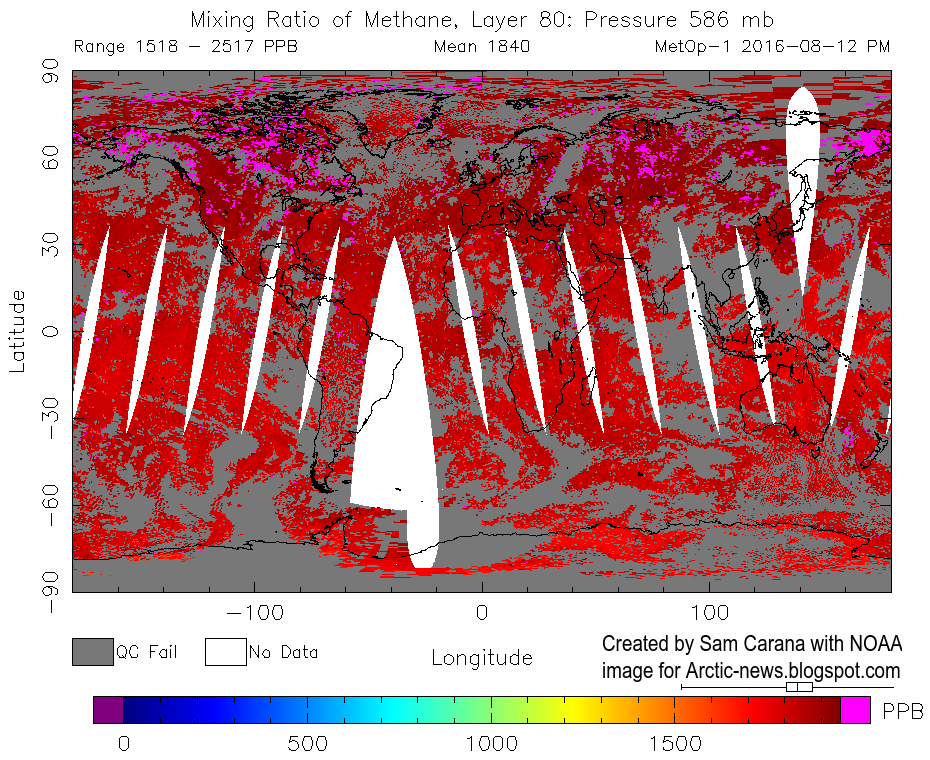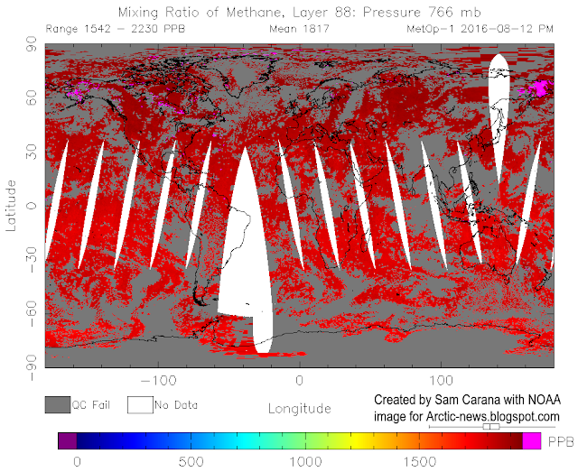 Methane levels as high as 2533 ppb were recorded that day (at 469 mb), compared to a mean global peak of 1857 ppb that day.