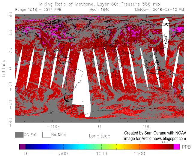 The magenta-colored areas on above image and the image below indicate that these high methane levels are caused by these wildfires in Russia's Far East. The image below shows methane levels as high as 2517 ppb at 586 mb.