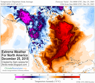 The image on the right illustrates this with a forecast for December 25, 2015, showing extreme weather for North America, with temperatures as low as 30.6°F or -0.8°C in California and as high as 71.5°F or 22°C in North Carolina. - Feedbacks such as rapid albedo changes in the Arctic and large amounts of methane abruptly released from the Arctic Ocean seafloor could dramatically accelerate the temperature rise. Furthermore, water vapor will increase by 7% for every 1°C warming. Water vapor is one of the strongest greenhouse gases, so increasing water vapor will further contribute to a non-linear temperature rise. The resulting temperature rises threaten to be non-linear, as discussed in the final section of this post.