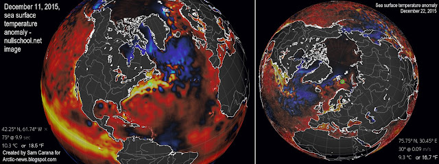 The image below gives an indication of the high temperatures of the water beneath the sea surface. Anomalies as high as 10.3°C or 18.5°F were recorded off the east coast of North America (green circle on the left panel of the image below) on December 11, 2015, while on December 20, 2015, temperatures as high as 10.7°C or 51.3°F were recorded near Svalbard (green circle on the right panel of the image below), an anomaly of 9.3°C or 16.7°F.