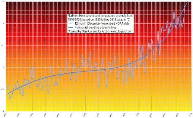 NOAA data show that the November global land and ocean temperature anomaly was 0.97°C, while the 3-month global land and ocean temperature anomaly was 0.96°C. The 12-month anomaly on November 2015 on land on the Northern Hemisphere (where most people live) was 1.39°C, as shown on the image below, while the trendline shows that for people living on the Northern Hemisphere, a 1.5°C rise compared to 1910-2000 could be reached as early as in 2017.