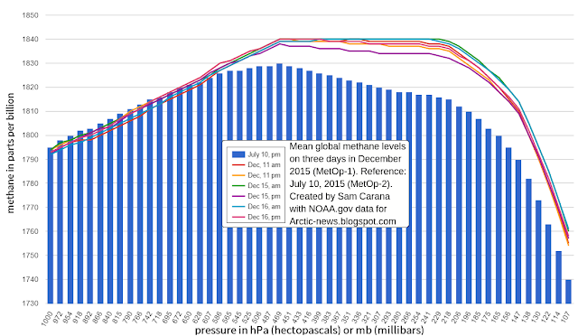 Methane is released over the Arctic Ocean in large amounts, and this methane is moving toward the equator as it reaches high altitudes. The image below illustrates how methane is accumulating at higher altitudes.