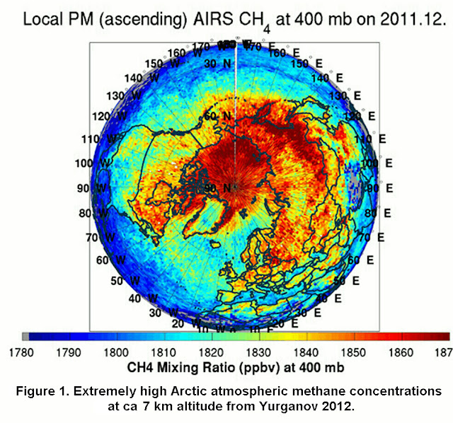 Methane formed by organisms in the water becomes trapped in the fabric of water ice crystals when it freezes and is stable below about 300 metres depth in the Arctic Ocean and on the shallow East Siberian Arctic Shelf. There are such massive methane reserves below the Arctic Ocean floor, that they represent 100 times the amount, that is required to cause a Permian style major extinction event, should the subsea Arctic methane be released into the atmosphere because of methane's giant global warming potential (100 to 1000 times CO2) over a short time period (Light and Solana, 2012 - 2014, Carana 2012 - 2014). There are also giant reservoirs of mantle methane, originally sealed in by shallow methane hydrate plugs in fractures cutting the Arctic seafloor and onshore in N. Siberia (Light, 2014, Carana 2013, Light, Hensel and Carana, 2015). The whole northern hemisphere is now covered by a thickening atmospheric methane global warming veil from Arctic methane emissions at the level of the jet streams, which is spreading southwards at about 1 km a day and already totally envelopes the United States (Figure 1). There must therefore be a world-wide effort to capture and thus depressurise the methane in the subsea and surface Arctic permafrost and eradicate the quantities accumulating in the ocean and atmosphere.