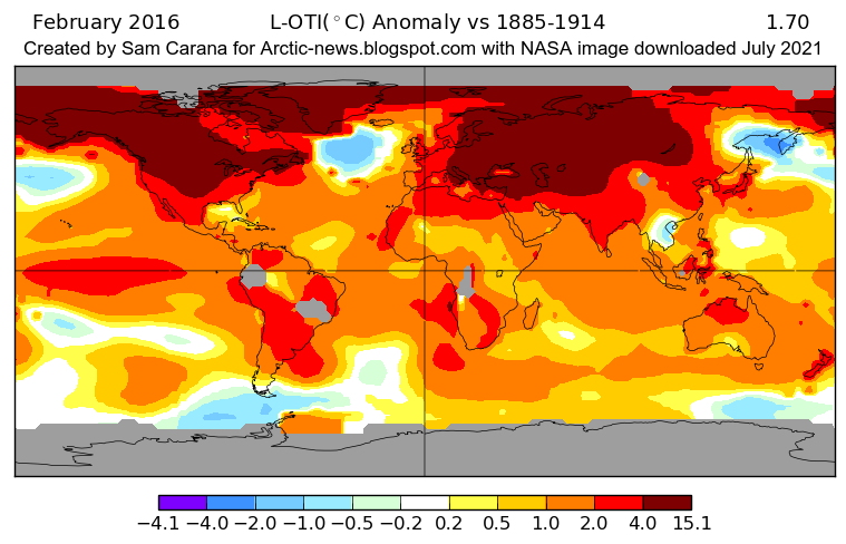 | In February 2016, the temperature was 1.70°C higher than in 1900 (i.e. 1885-1914, the 30-year period centered around the start of 1900) |