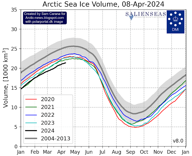 The images above and below show that Arctic sea ice volume has recently been the lowest on record for the time of year.
