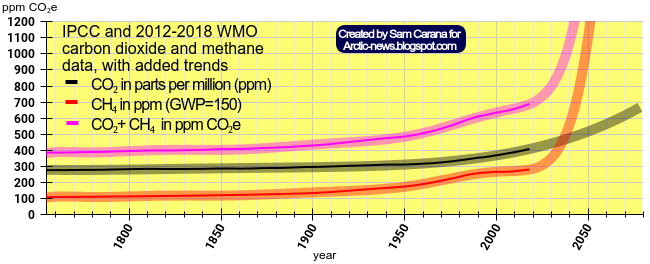 Above image shows methane in ppm CO₂e (carbon dioxide equivalent), using a Global Warming Potential (GWP) of 150. The image shows how carbon dioxide and methane could jointly cross 1200 ppm CO₂e in 2040. The image uses IPCC and WMO data up to 2018 to display three lines: