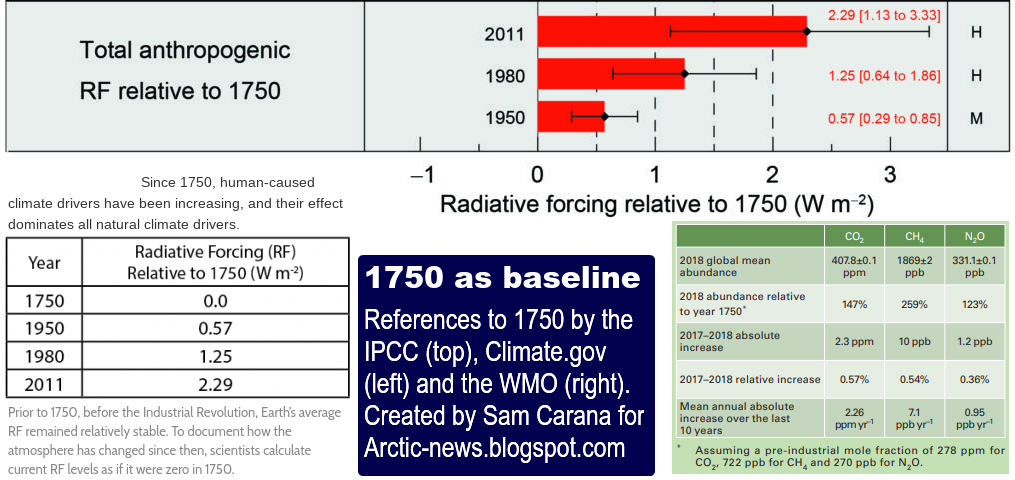 Above image shows that the World Meteorological Organization (WMO) provides annual reports, in its Greenhouse Gas Bulletin, of greenhouse gas levels such as carbon dioxide and methane relative to year 1750. The IPCC Assessment Reports show human-caused radiative forcing by emissions and drivers relative to 1750, based on such figures. Similarly, the U.S. government uses 1750 as the year when the Industrial Revolution started and when humans started to warm the climate.