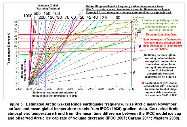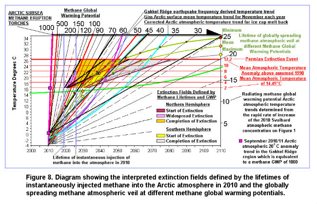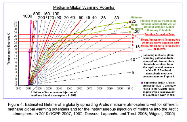 Figure 3 shows a set of radiating Arctic atmospheric methane global warming temperature trends calculated from the steep methane atmospheric concentration gradient at Svalbard in 2010 (ESRL/GMO, 2010 - Arctic-Methane-Emergency-Group.org). The range of extinction temperature anomalies above the assumed 1990 mean atmospheric temperature of 14.49 oC (Shakil, 2005) are also shown on this diagram as well as the 80 oF (26.66 oC) major Permian extinction event temperature (Wignall, 2009).