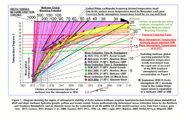 Figure 7 diagramatically shows the funnel shaped region in purple, yellow and brown of atmospheric stability of methane derived from Arctic subsea methane eruption fountains/torches formed above destabilized shelf and slope methane hydrates (Connor, 2011). The width of this zone expands exponentially from 2010 with increasing temperature to reach a lifetime of more than 75 years at 80 o F (26.66 oC) which is the estimated mean atmospheric temperature of the major Permian extinction event (Wignall 2009). The previous most catastrophic mass extinction event occured in the Permian when atmospheric methane released from methane hydrates was the primary driver of the massive mean atmospheric temperature increase to 80 oF (26.66 oC) at a time when the atmospheric carbon dioxide was less than at present (Wignall, 2009).