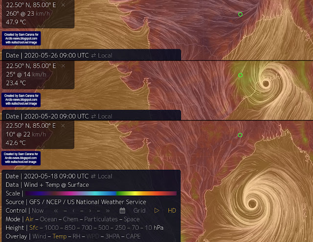 The bottom panel shows that on May 18, 2020 09:00 UTC, the temperature at a location in India was 42.6°C or 108.6°F, as Amphan was approaching from the South.